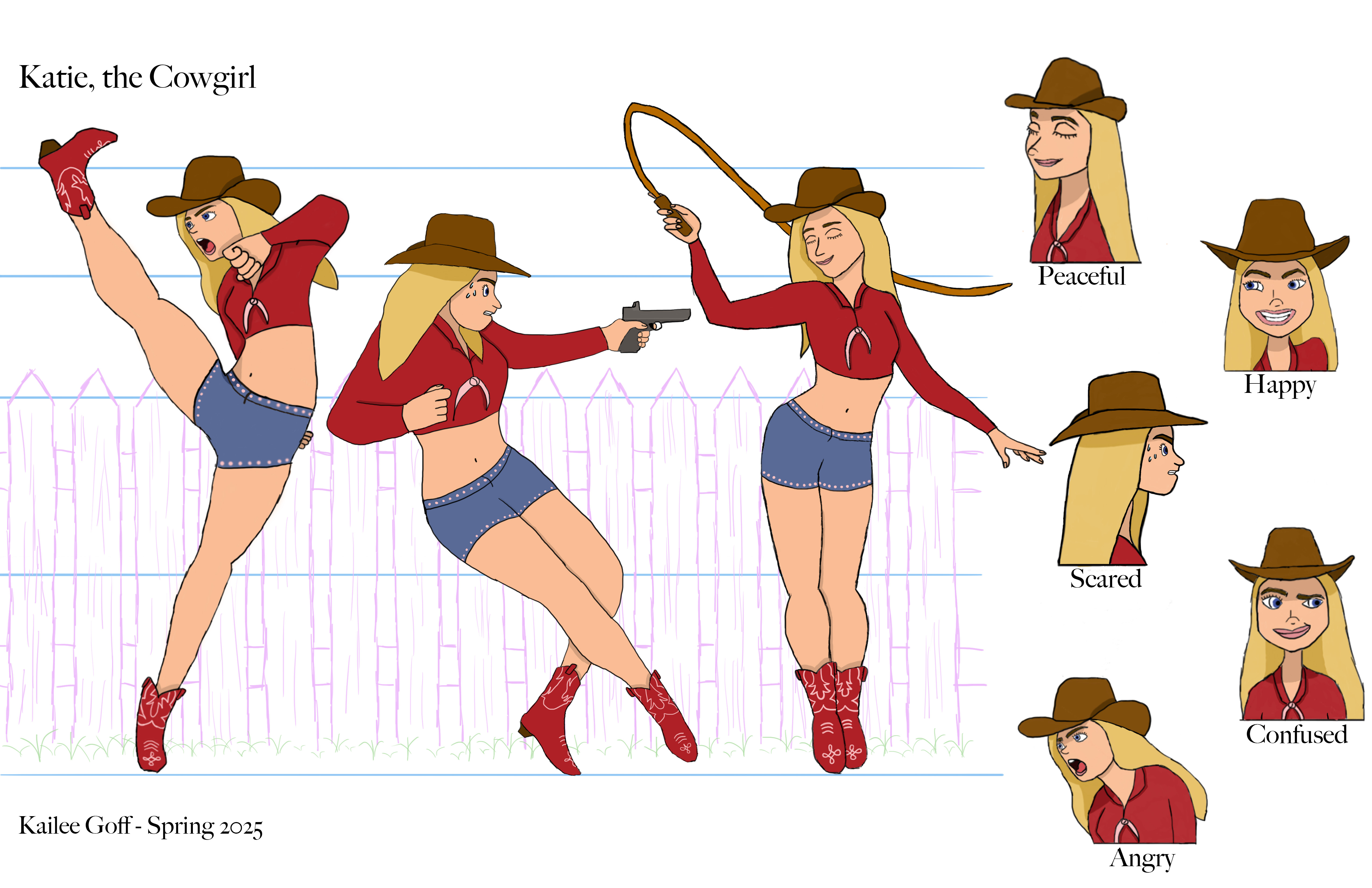 Solution: For this project, I decided to illustrate a sassy cowgirl I may once had wished to be, but my alter ego – Katie, the cowgirl, is her. By using my knowledge of anatomy from my earlier human drawing classes, I was able to bring this, almost life like human character to life, and with inspiration from video games like Fortnite I was able to come up with some fun, dynamic poses.